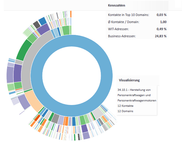 In unserem Fall konnte knapp 25% der Domains auch Branchen zugeordnet werden. Die größte Zielgruppe ist mit 1.960 Adressen die "Erbringung wirtschaftlicher Dienstleistungen". Davon sind wiederum 534 Werbung, 442 Unternehmensberatung und Public Relations, 360 Softwareberatung und Entwicklung. In der dritten und letzten Stufe wird es dann noch feiner, zB. sind es dann 358 Kontakte die Unternehmens- und 84 Public Relations Beratung machen.